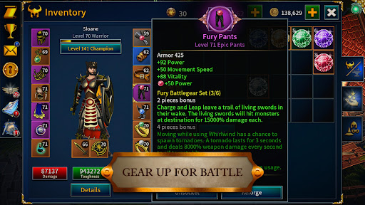 宝箱を開けて、金、宝石、バトルギアを略奪します。光沢のある胸当て、威嚇するようなヘルメットとフード、スパイク付きのショルダーパッド、神秘的なマントやマントを装備します。盾で身を守るか、戦士として2つの武器を使用することを選択します。